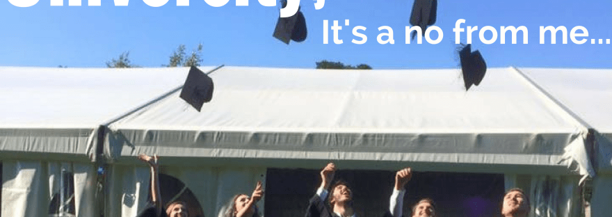 University. The final step on your personal ladder before you reach your dream career, the golden ticket to any job you desire and the partying along the way? That's just a bonus. Or is it? Uni is pushed by teachers during your a-levels as being the only way you're going to succeed in life; if… Continue reading University; its a no from me…